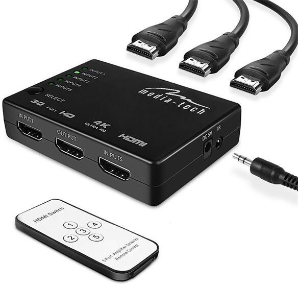 Media-Tech HDMI elosztó  5db HDMI port  4K és 3D támogatás  Plug and Play (nincs szükség illesztőprogramra)  Select gombbal és a táviránítóval választható ki, hogy melyik port legyen aktív  Méret 110 x 60 x 15 mm  Garancia 24 hónap