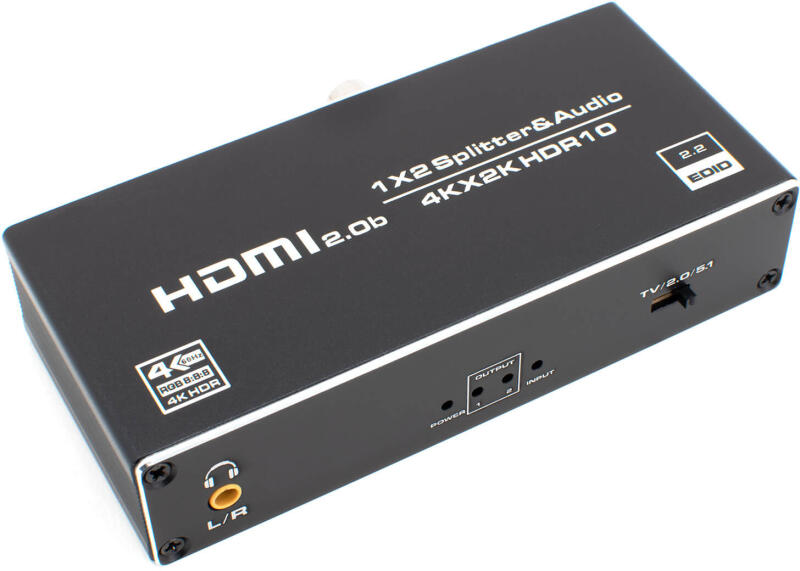 Ez a kis méretű HDMI Splitter elosztó lehetővé teszi egy HDMI jelbemenet megosztását két külön kijelzőre, illetve a HDMI jelből leválasztja a hangsávot, amit digitális optikai és analóg kimeneteken is továbbít. Audió leválasztás funkció három fokozatban állítható. Az eszköz kiváló képfeldolgozási és átviteli képességekkel, stabil kimeneti jellel, megbízható teljesítménnyel rendelkezik, mindemellett a készülék melegedése elhanyagolható. Telepítésre nincs szükség, az eszköz Plug & Play. Tápellátása 5V DC, hozzá az adapter és a Micro-USB kábel tartozék. Ideális otthoni, irodai, számítógépes helyiségben történő alkalmazáshoz. Felbontása akár 4K@60Hz, 3D támogatás. Kompatibilis Nintendo Switch, PS4 Pro, Xbox 360, Xbox One X, PS3, Blu-ray lejátszó, Apple TV, laptop, HDTV, HD monitor és sok más készülékkel.