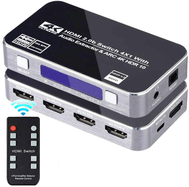 Ez a kisméretű HDMI Switch lehetővé teszi négy külön HDMI jelbemenet egyetlen monitoron történő megjelenítését. Az eszköz kiváló képfeldolgozási és átviteli képességekkel, stabil kimeneti jellel, megbízható HDMI kapcsolási teljesítménnyel rendelkezik. Telepítésre nincs szükség, az eszköz Plug & Play. Kényelmes és gyors a váltás a készülékek között az eszközbe beépített kapcsoló segítségével, illetve távirányítóval. Ideális otthoni, irodai, számítógépes helyiségben történő alkalmazáshoz. Felbontása akár 4K@60Hz, 3D, HDR (High Dynamic Range). ARC funkció kapcsolható. Audiójel leválasztás optikai kimeneten digitálisan, vagy 3.5mm Jack kimeneten analóg formátumban lehetséges. Kompatibilis Mac Mini, MacBook Pro, PS3 / PS4, Apple TV, Blu-Ray / DVD lejátszó, VR, HDTV, HD kivetítő, Xbox 360, Xbox One és sok más készülékkel.